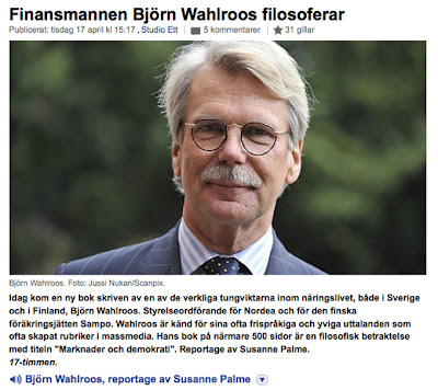 En av Skandinaviens mäktigaste företagsledare, finländske Björn Wahlroos, dök upp som gubben i lådan i P1:s Studio Ett tisdag 17 april 2012. Orsaken var hans bok ”Marknader och demokrati” på 486 sidor. Björn Wahlroos tror på Milton Friedman (som också inspirerade Ronald Reagan, Richard Nixon och Margaret Thatcher) och menar att ekonomer och bankledare är bättre än politiker i att leda nationer. Politiker frestas till överdåd för att locka väljare och förbrukar pengar som inte finns, därvid intecknar de framtiden. (Nu har man inte precis märkt någon motvilja hos Goldman Sachs och BNP Paribas att spela med.)